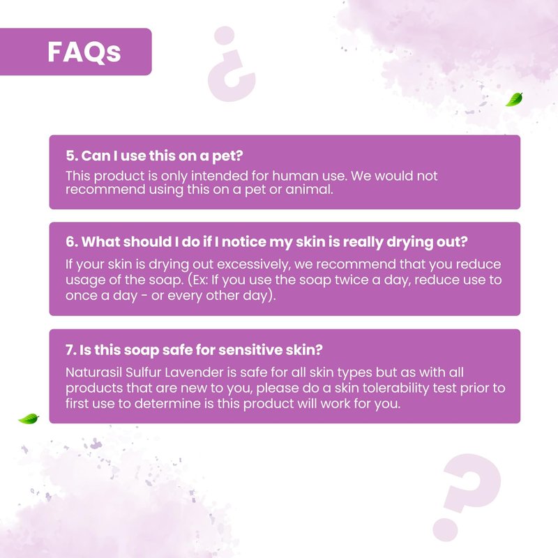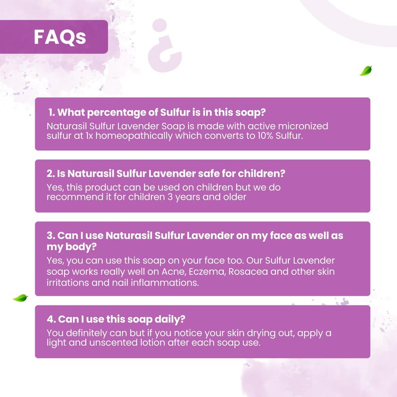 This sulfur soap by Naturasil is quite the game-changer! Imagine having a lavender soap that doubles as a medicated soap, helping you deal with all those pesky skin issues. It's like having a spa day and a visit to the dermatologist, all wrapped up in one neat little bar. This soap is not just a natural sulfur soap, it's a sulfur face and body cleansing bar soap, and it even works for things like acne, eczema and skin itching as well as irritation. It's like your very own secret weapon against skin troubles, and the bonus is that it's safe for both adults and kids. Struggling with common skin conditions like acne, bug bites, warts, and itching? This sulfur soap is your new best friend. It's like having a mini, portable skin clinic at your fingertips. Plus, the lavender scent is just divine, making you feel relaxed while it does its magic. What sets this soap apart? Well, it's crafted with micronized volcanic sulfur and pure lavender oil. It's like a union of nature and science, working together to give you the best skin possible. Plus, it's cruelty-free, because who doesn't love a brand that cares? Before you start using this sulphur face soap, make sure you're not allergic to sulfur or sulfa-based products. Also, take off your jewelry before application to avoid any unwanted reactions. And remember, if you experience any discomfort, it's best to consult a physician. So, ready for a whole new soap experience? Give this sulfur lavender soap a try! It's not just soap, it's a natural and effective solution to many of your skin woes.