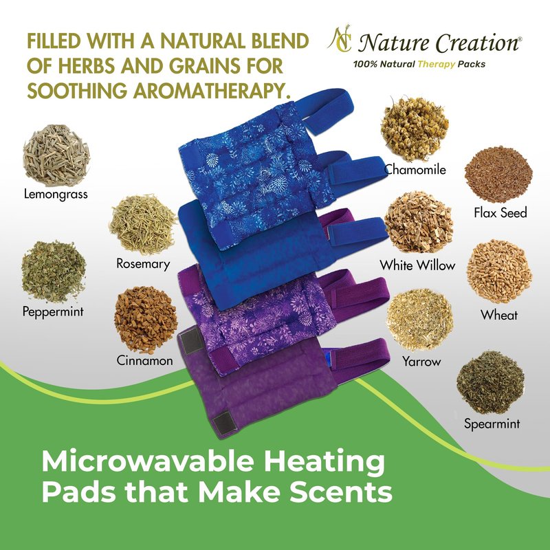 Nature Creation microwaveable & reusable heat pads can conveniently be used on your knee, elbow, joints and muscles, as it molds easily to any body part. If you want a multipurpose heating pad for joints pain, injuries, bruises, or swelling, you can place them in the microwave or freeze them. It's the ultimate hot and cold pad. It has an ideal weight which provides gentle pressure. It has 2 elastic hook and loop fastners for easy hands-free application. Each heating pad has natural ingredients like flax and wheat that excel at holding heat for long periods to keep you warm and cozy no matter where you are. Filled with an aromatic mix of herbs, as soon as you open the package you'll be smelling soothing scents. Whether you use it as a warm compress or a cold compress, the amazing smells of herbs like chamomile, cinnamon, and lemongrass may help reinvigorate you. Our heating and cooling pad feature a super soft cotton fabric that gently hugs your skin and provides heat. Also, our heating pad can be a lovely gift of wellness for someone you care about! Our shoulder and neck pads make an excellent gift for birthdays, holidays, or just because! \