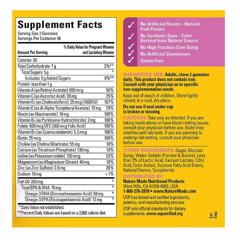 - Prenatal nutritional support supplement: contains one 120 count bottle of Nature Made Prenatal Gummies with DHA and Folic Acid for a 60-day supply