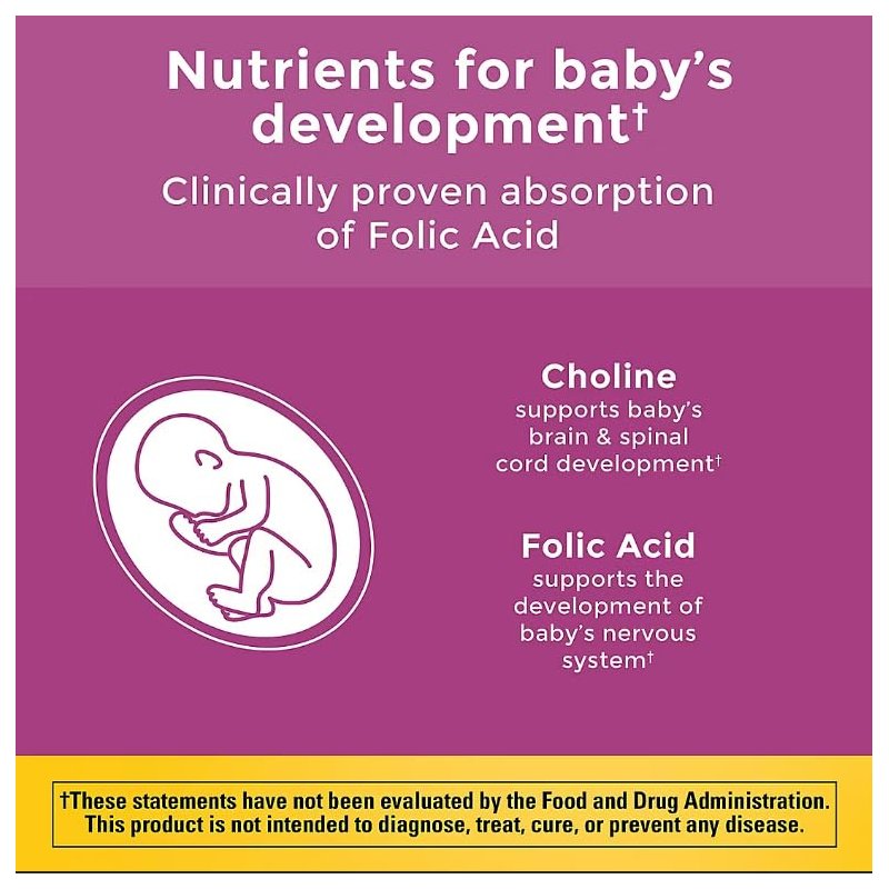 - These Nature Made prenatal vitamins with DHA and Folic Acid support a baby's brain, eye and spinal cord developmen