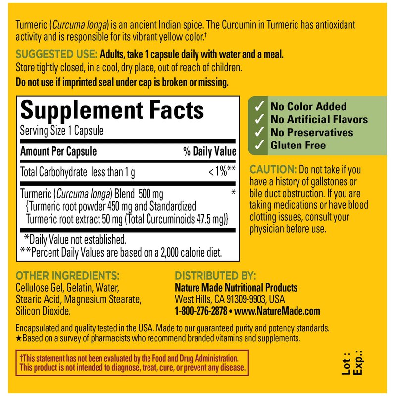 - Antioxidant support herbal supplement: contains one 60 count bottle of Nature Made Turmeric Curcumin 500 mg Capsules for a 60-day supply