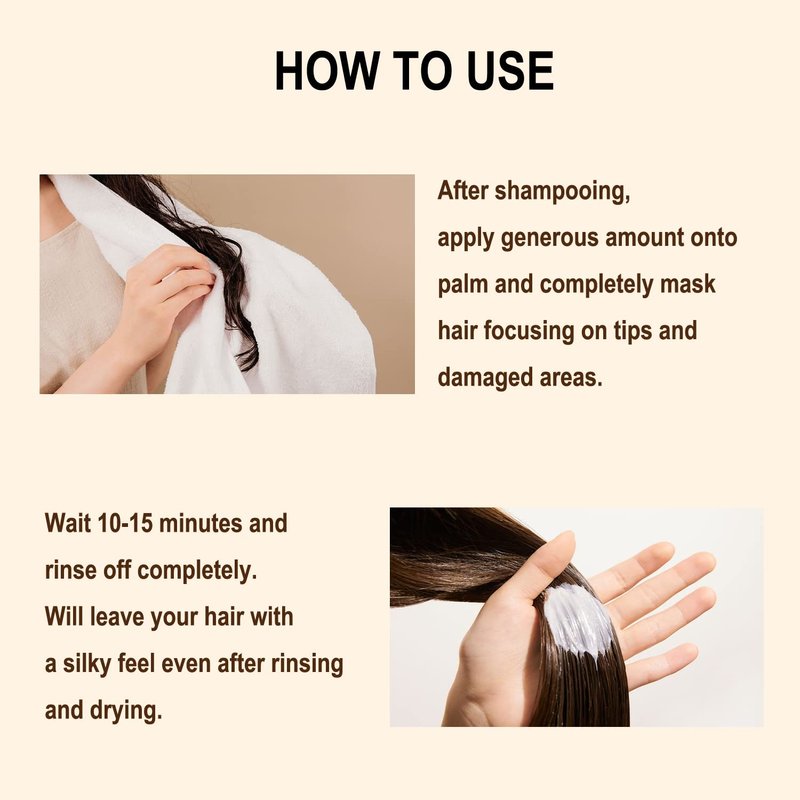 After shampooing, apply generous amount onto palm and completely mask hair focusing on tips and damaged areas. Wait 10-15 minutes and rinse off completely. Will leave your hair with a silky feel even after rinsing and drying.