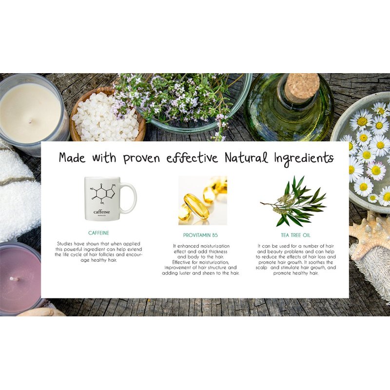 Studies have shown that when caffeine is applied, this powerful ingredient can help extend the life cycle of hair follicles and encourage healthy hair. Developed with botanicals known to help stimulate circulation and offer gentle exfoliation of hair follicles for healthy scalp and hair. Panthenol is effective for moisturization, improvement of hair structure and adding luster and sheen to the hair.