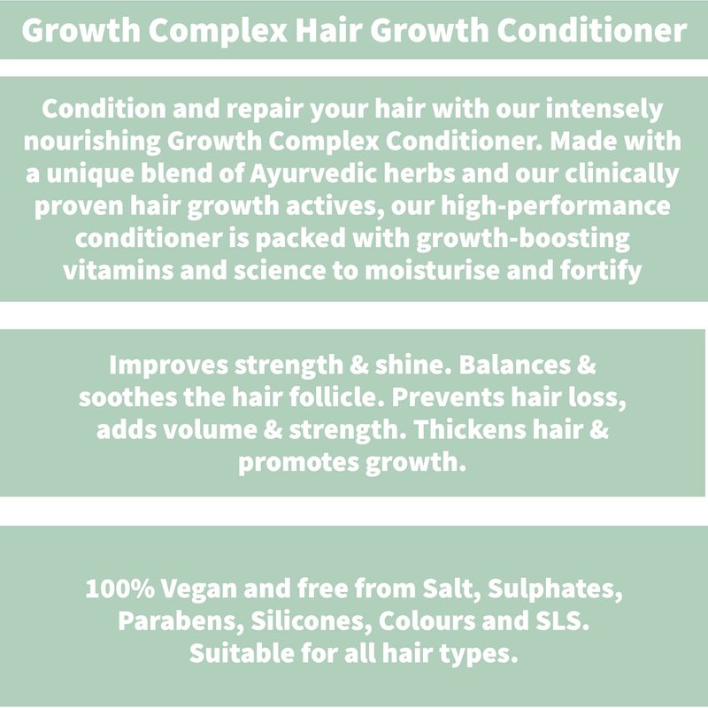 With Ayurvedic herbs Ashwagandha, Bhringraj, and Amla, our effective root-growth complex stimulates healthy hair growth for longer, stronger tresses. Cleanse and revive your hair with our moisturizing and stimulating Growth Complex Shampoo. Formulated with Ayurvedic herbs that originate from India and the latest scientifically-proven hair growth actives, our naturally infused shampoo fuses ancient and modern expertise to promote hair growth and strengthen strands from root to tip. Make it part of your shower time ritual to reap the rewards. Condition and repair your hair with our intensely nourishing Growth Complex Conditioner. Made with a unique blend of Ayurvedic herbs and our clinically proven hair growth actives, our high-performance conditioner is packed with growth-boosting vitamins and science to moisturize and fortify. Use with our Growth Complex Shampoo to promote healthy hair growth and longer, stronger lengths.