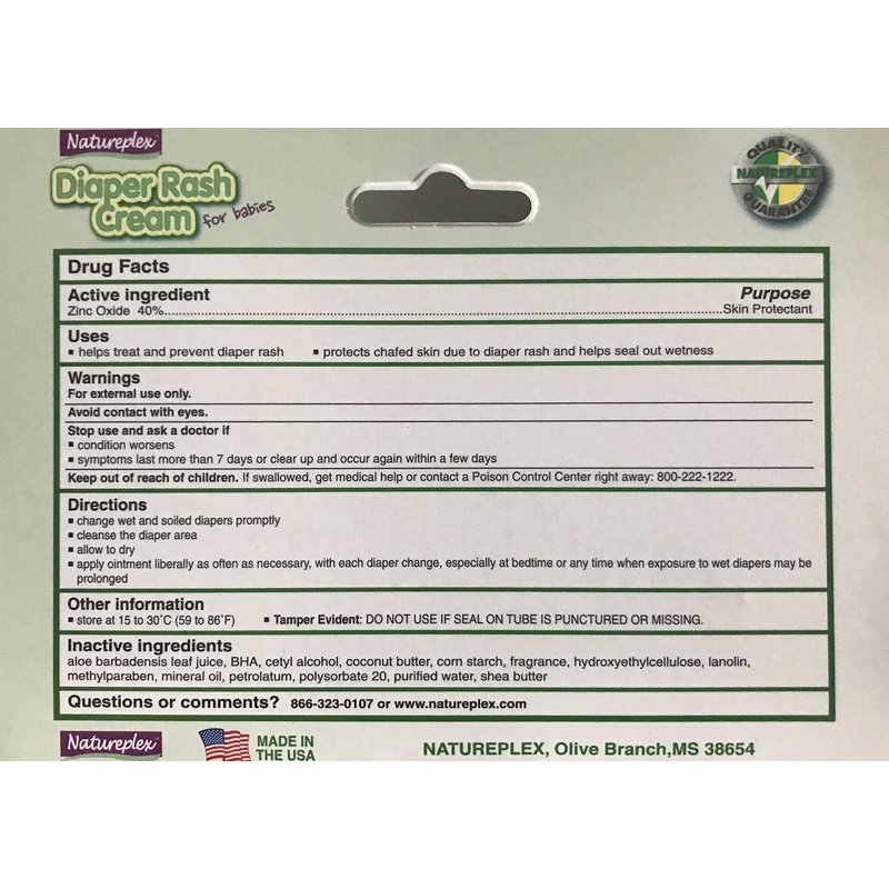 Natureplex Diaper Rash Cream for Babies. 40% Zinc Oxide with Aloe. Promotes healing. Helps treat and prevent Diaper rash. Protects chafed skin due to diaper rash and helps seal out wetness.