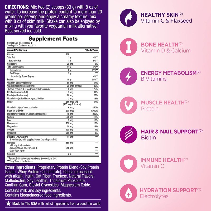 - 15g PROTEIN PER SERVING TO SUPPORT MUSCLE HEALTH.(2) Featuring a blend of high-quality complete proteins containing all nine essential amino acids; includes a blend of soy protein isolate and whey protein concentrate, both complete proteins