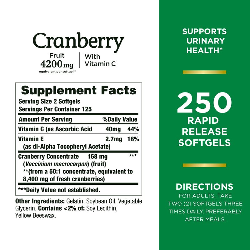 - CRANBERRY PILLS: Made using cranberry concentrate, each serving Nature’s Bounty Cranberry with Vitamin C softgel contains the equivalent of 4,200 mg of fresh cranberries, along with 40 mg of Vitamin C and 2.7 mg of Vitamin E