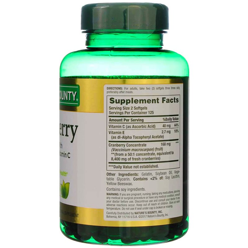 Nature's Bounty Cranberry Fruit 4200mg Herbal Supplement Softgels 250 CT.Nature's Bounty Cranberry Fruit 4200mg Equivalent Per Softgel- 250 CT.With Vitamin C. Supports urinary health. Herbal health.250 rapid release softgels.Herbal supplement.Over 40 years of trusted quality.At Nature's Bounty, we are committed to your health.For over 40 years we have been making trusted products, backed by science, and made with only the purest ingredients... guaranteed.So you can get the most out of life every day.Guaranteed quality.Laboratory tested.Non-GMO, no artificial color, no artificial flavor, no artificial sweetener, no preservatives, no sugar, no starch, no milk, no lactose, no gluten, no wheat, no yeast, no fish.Sodium free
