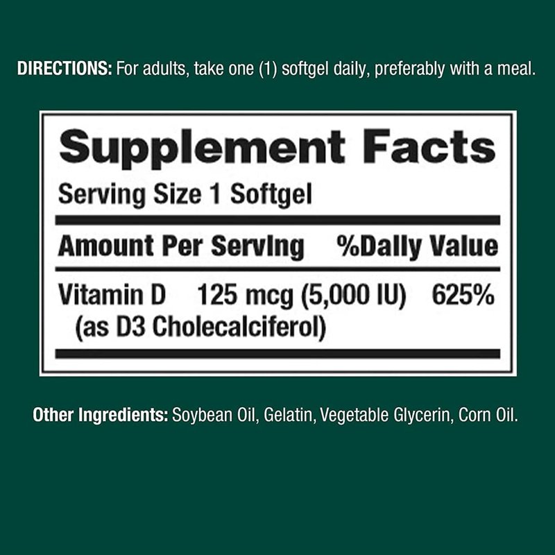 Nature's Bounty Vitamin D - the "Sunshine Vitamin" is an essential nutrient that the body creates by converting cholesterol in the body via sunshine. However, today's culture of cubicles, sunscreen, and near-round-the-clock indoor living minimizes our exposure to natural sunlight for the needed period of time for Vitamin D to form. Supplementing with Nature's Bounty Vitamin D3 is an easy way to increase your daily intake of this important nutrient.