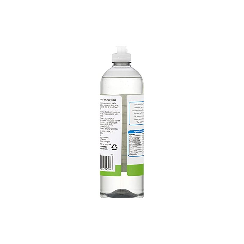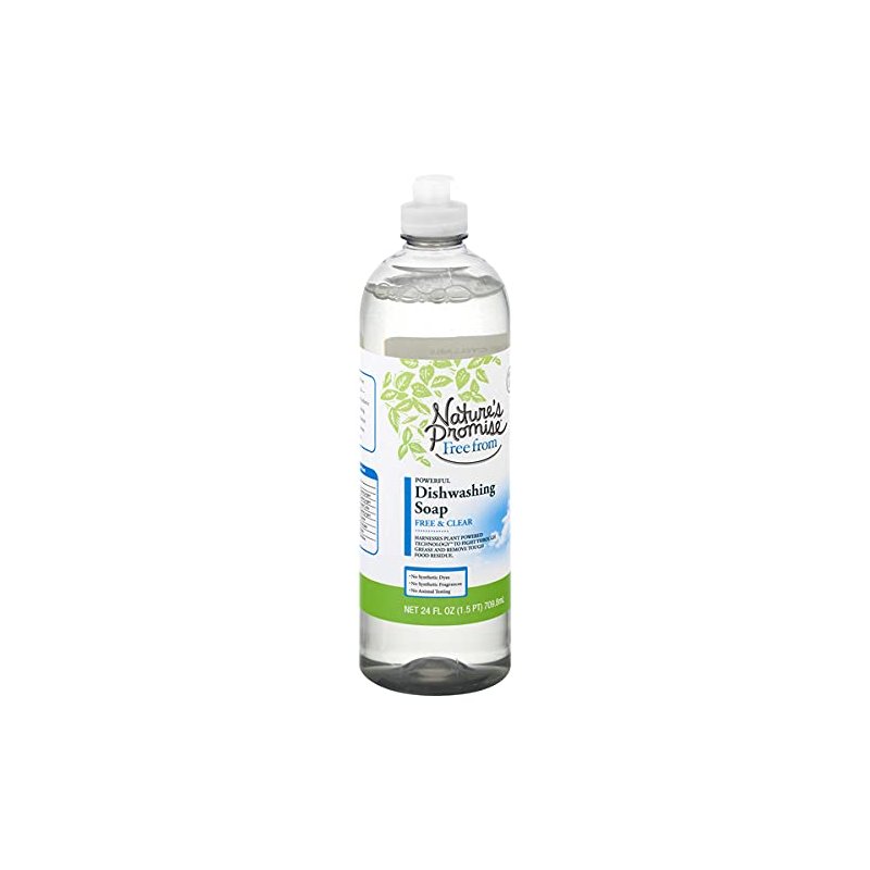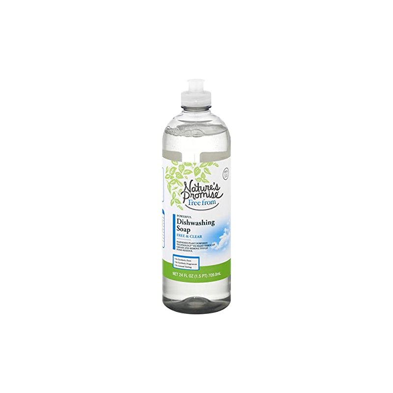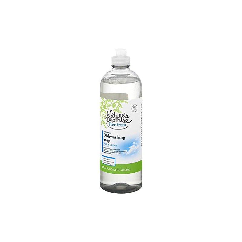 Nature's Promise Liquid Dish Detergent Free and Clear Soap - 24 Fl. Oz. Ingredient - Purpose: Water - Solvent. Sodium laureth sulfate - plant-based cleaning agent. Caprylyl/capryl glucoside - plant-based cleaning agent. Sodium methyl 2-sulfolaurate - plant-based grease cutter. C10-16 alkyldimethylamine oxide - Plant-based cleaning agent. Sodium chloride - mineral salt thickener. Citric acid - Plant-based pH Adjuster. Sodium hydroxide - Mineral pH adjuster. Tris (N-Hydroxyethyl hexahydrotriazine - Synthetic Preservative. No animal testing. 100% Recyclable. Harnesses plant powdered technology to fight through grease and remove tough food residue. Septic safe. Our Nature's Promise Free from Dishwashing Soaps are just that - contains no synthetic dyes, no synthetic fragrances and no animal testing. This means you can feel good about making them a part of your home.