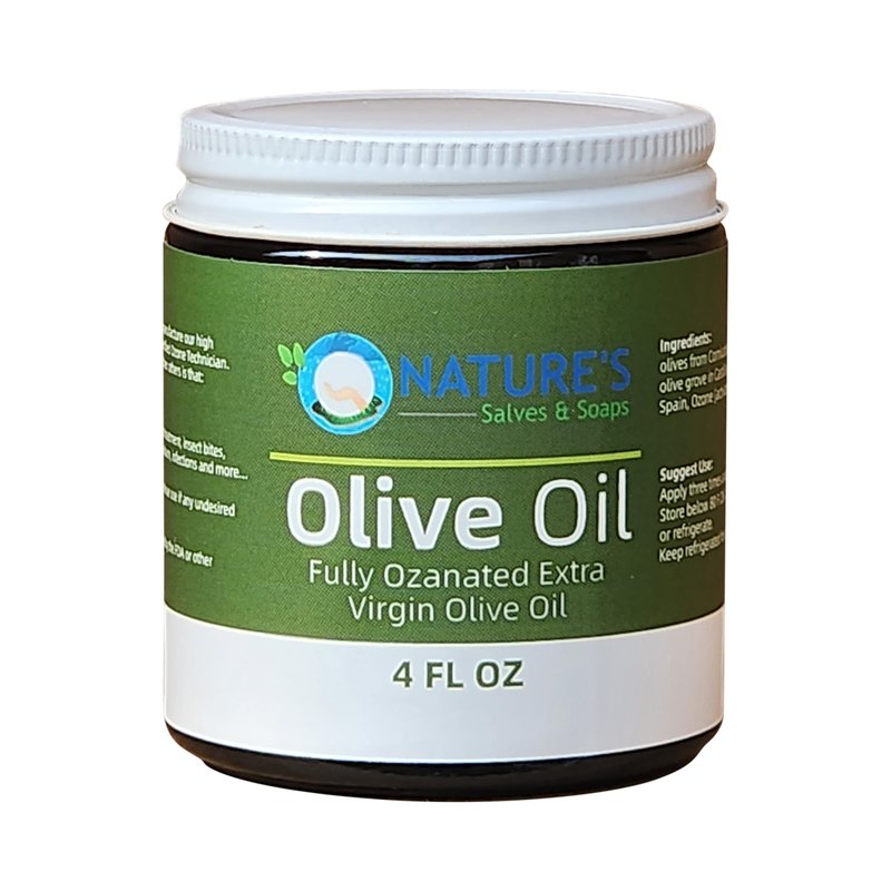 Nature's Salves and Soaps Fully Ozonated Cold Pressed Extra Virgin Olive Oil. Holistic, Homeopathic, Natural, Dental, Skin, Hair - 4 Oz - * Glass Jar *