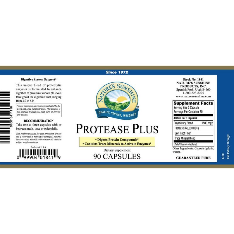 Nature's Sunshine Protease Plus, 90 Capsules | Powerful Digestive Enzyme Supplements with 60,000 HUT Protease to Break Down Proteins and Amino Acids