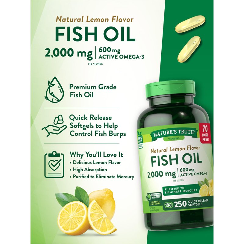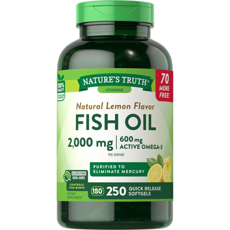 Nature's Truth Burpless Fish Oil Pills 2000 mg | 600 mg Omega 3 | 250 Softgels | Natural Lemon Flavor | Non-GMO, Gluten Free Supplement