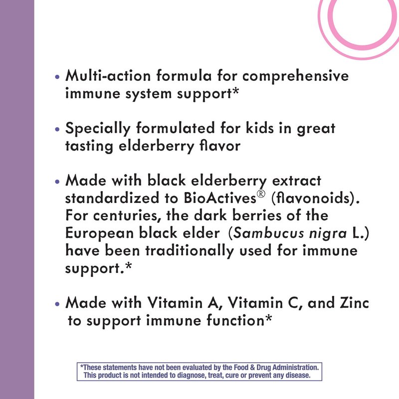 - Made with vitamin C, vitamin A, zinc, and black elderberry extract.