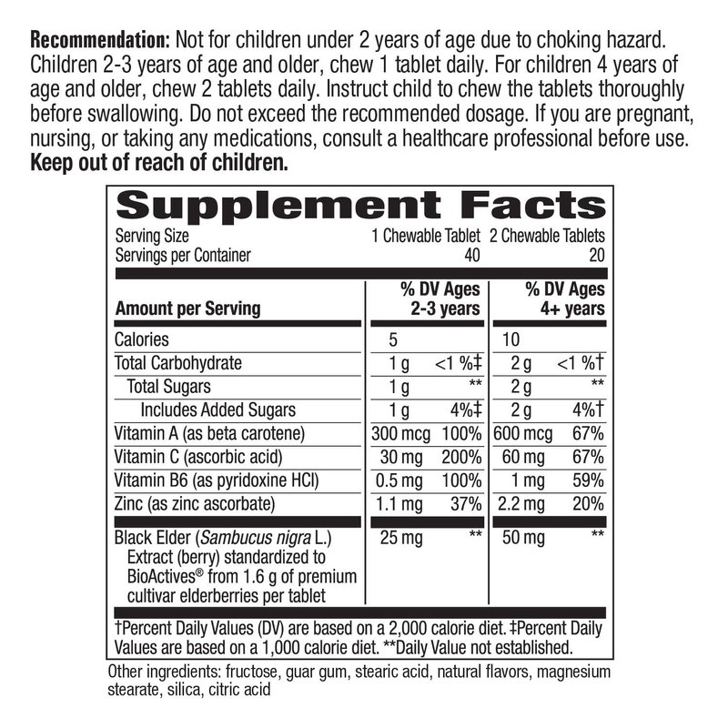 Nature's Way Sambucus Elderberry For Kids with Vitamin C and Zinc, Immune Support*, 40 Chewable Tablets