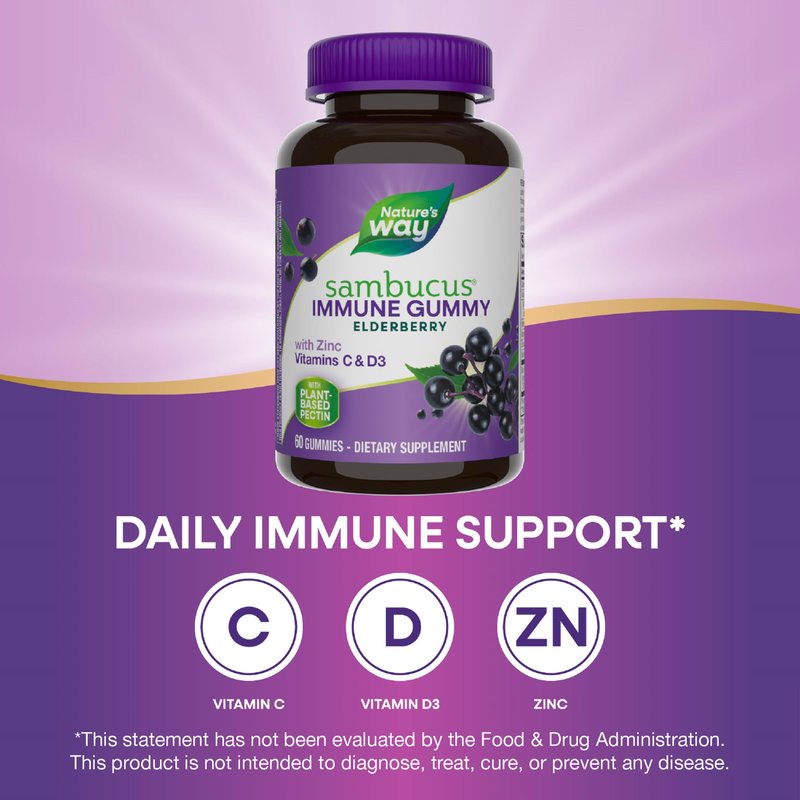 Nature’s Way Sambucus Elderberry Immune Gummies, Daily Immune Support for Kids and Adults*, with Vitamin C, Vitamin D3, Zinc, Gluten Free, Vegetarian, 60 Gummies (Packaging May Vary)
