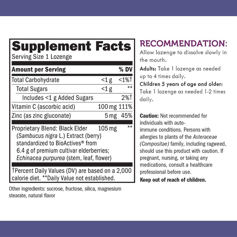 - Support your immune health every day with delicious lozenges.* Formulated with zinc, vitamin C, and Echinacea for immune support, plus black elderberry extract.*