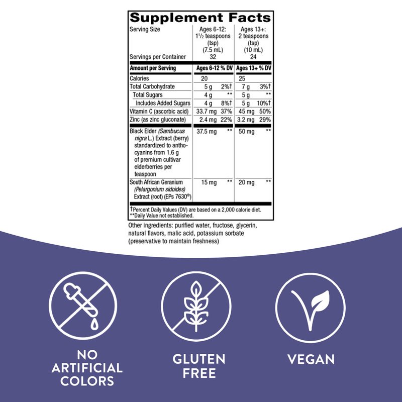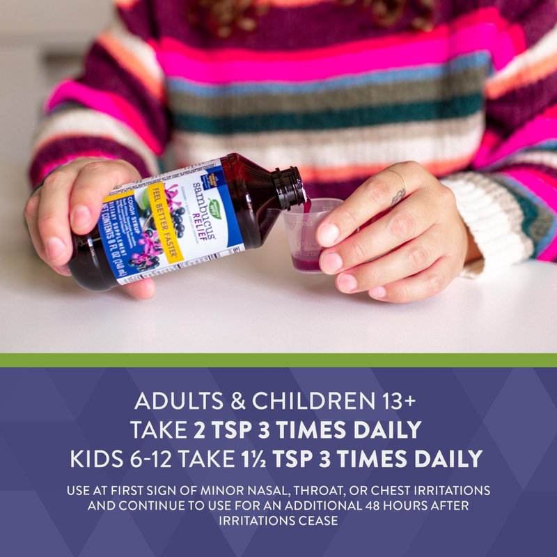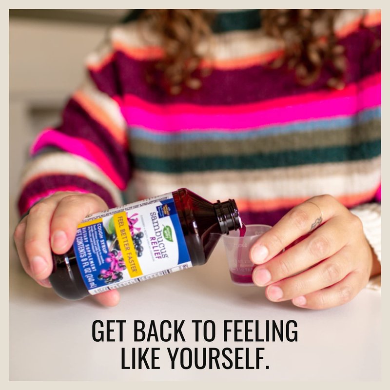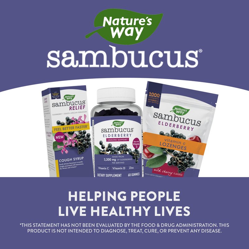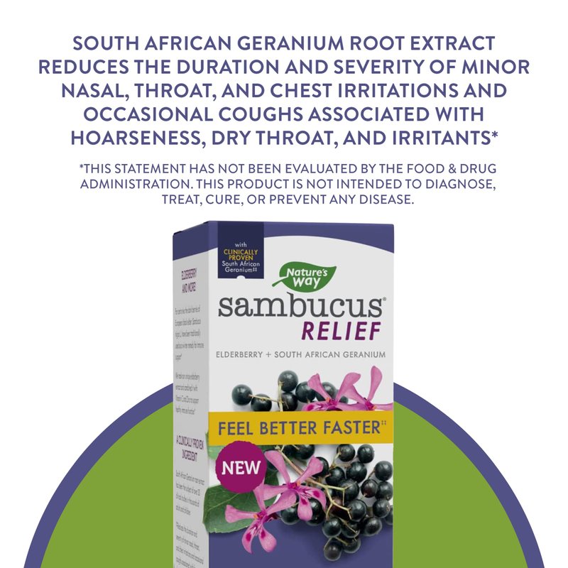 - Nature's Way Sambucus Relief Cough Syrup unites South African Geranium root extract and black elderberry extract, vitamin C, and zinc to support immune health.*
