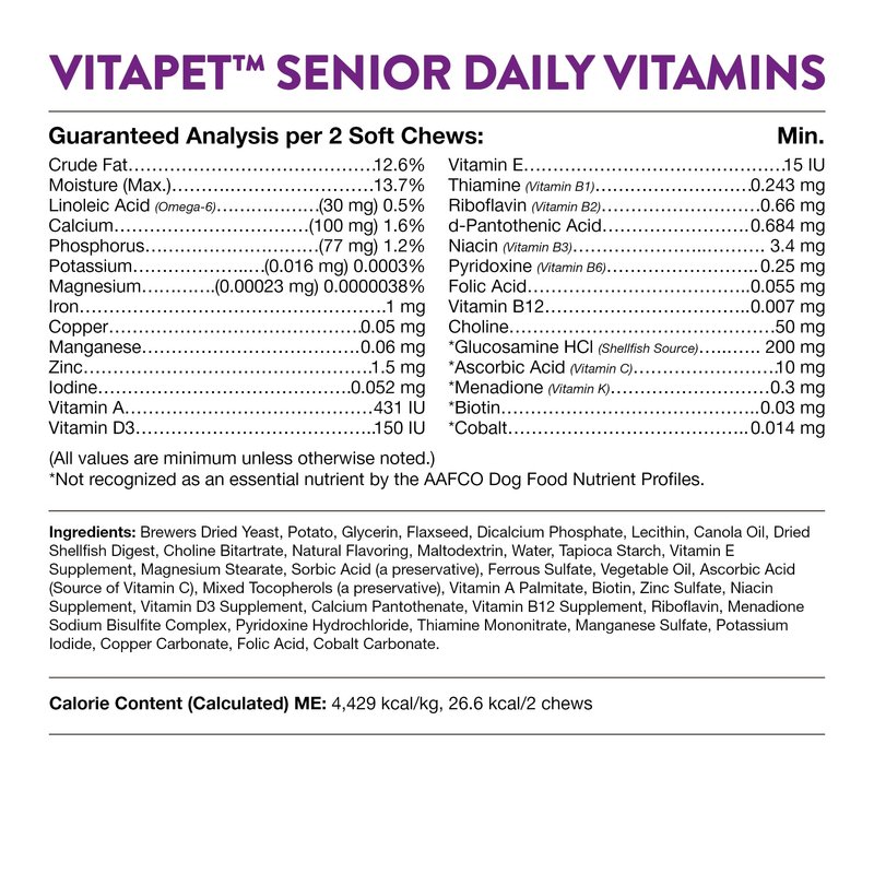 - DAILY DOG VITAMIN SUPPLEMENTS: Each soft chew dog supplement is enhanced with vitamins and minerals, as well as glucosamine to offer joint support for senior dogs. Give your canine companion the support he needs as he endures the aging process.