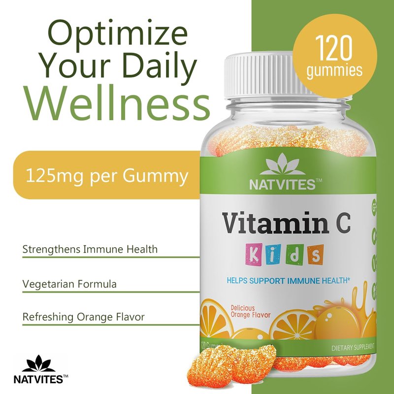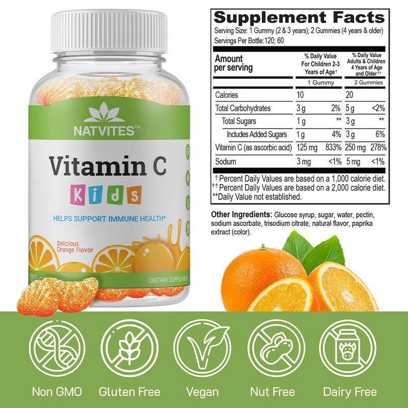 Natvites Vitamin C Gummies for Kids, Orange Flavored, Immune Support Supplement, Non-GMO, Gluten-Free, Vegan, Nut-Free, and Dairy-Free, 120 Count (Pack of 1)