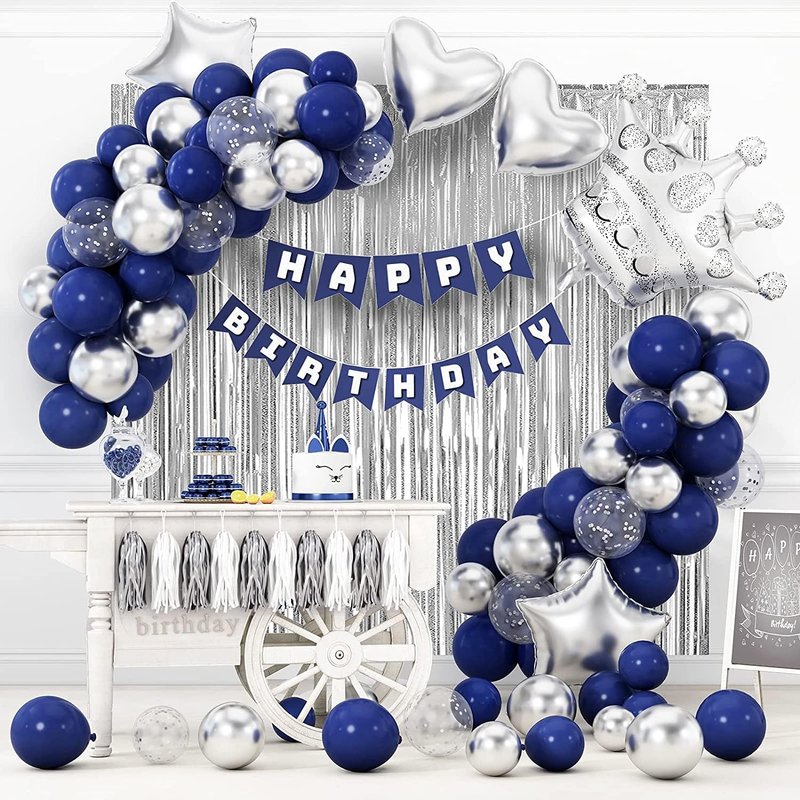 - [Great Value Pack:]: - Perfect birthday decoration set for you . Navy Blue and Metallic silver is a beautiful and attractive color, it’s popular . Our Navy Blue birthday decorations set features Navy Blue and Metallic silver balloons with the silver fringe curtain serving as your birthday party backdrop. Absolutely ideal for 1st 10th 13th 16th 18th 20th 21st 25th 30th 40th 50th 60th 70th birthday party.