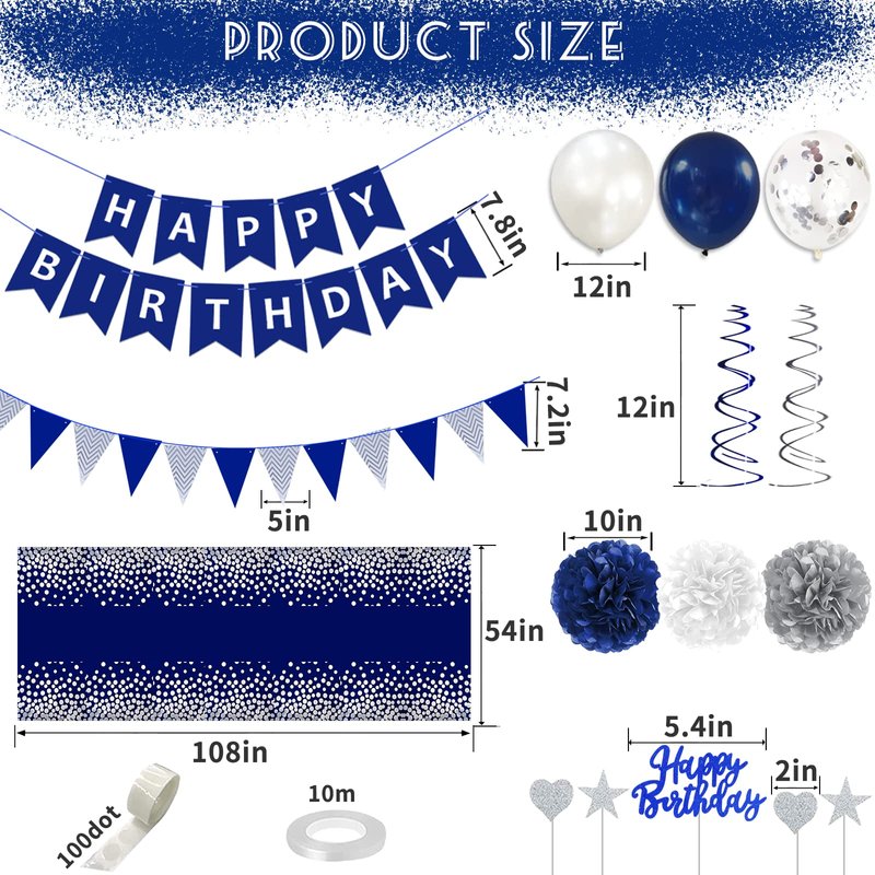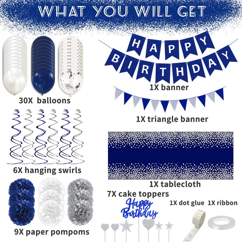 - 🔵All In One Package: Navy blue birthday decorations for men: 1Pcs happy birthday banner blue, 1pcs navy blue&silver pennant banner, 9Pcs paper pompoms(3*white+3*blue+3*silver), 6Pcs hanging swirls(3*silver+3*white), 10Pcs white confetti balloons, 20Pcs latex balloons(silver 10Pcs+dark blue 10Pcs), 7pcs cake toppers, 1pcs navy blue&silver tablecloth, 1pcs ribbon, 1pcs dot glue, navy blue and silver party decorations over 57pcs totally.