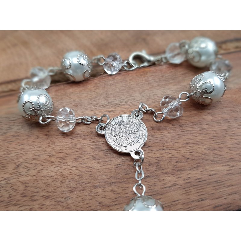 Nazareth Store Saint Benedict Evil Protection Medal White Clear Crystal Beads Rosary Car Auto Mirror Rearview
