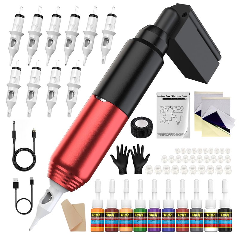 - The tattoo set includes a tattoo gun, RCA tattoo thread, tattoo battery, tattoo ink, transfer paper, tattoo bandage, tattoo cylinder needle, ink cap, disposable gloves, fake skin, and user manual. A complete tattoo kit is a great choice for beginners, beginners, and apprentices.