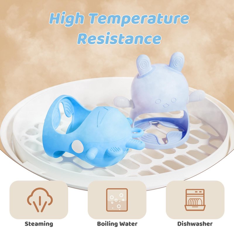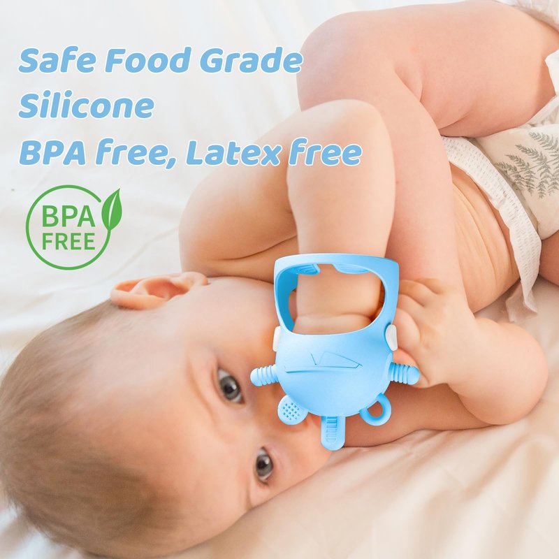 - 💙Safe Design: NCVI baby hand teething toys are made of high-quality food-grade silicone. No irritating odor,non-toxic,BPA-free. 100% safe for babies. There is a stem inside for the little hand to grab.Baby's wrist still could be free which keep hand comfortable.