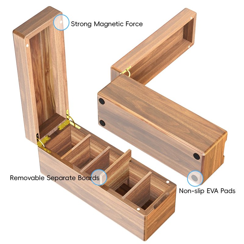 - Well-thought-out Design: The wooden divider inside of the card storage box is to keep the cards upright. And the ergonomic groove is so convenient for easy opening. Magnets help to shut the box closely. Non-slip EVA pads keep the bottom of card organizer and your desk from scratching.
