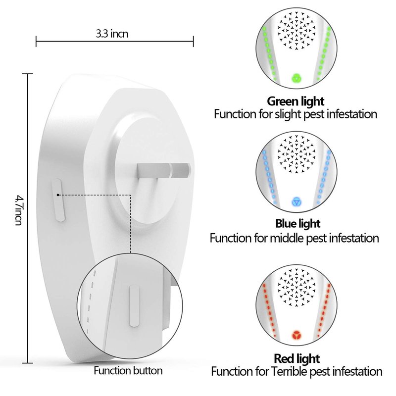 There are 3 operation modes,different light colors show different functions, green light is used for slight pest infection, human can not hear, blue light is used for middle pest infection, human can not hear, red light is used for terrible pest infection, human can hear, do not turn on red when human are inside the house, as this mode produces noise making human uncomfortable, turning on this mode when human are not in the house