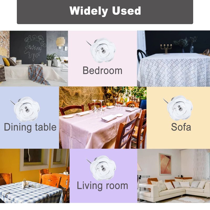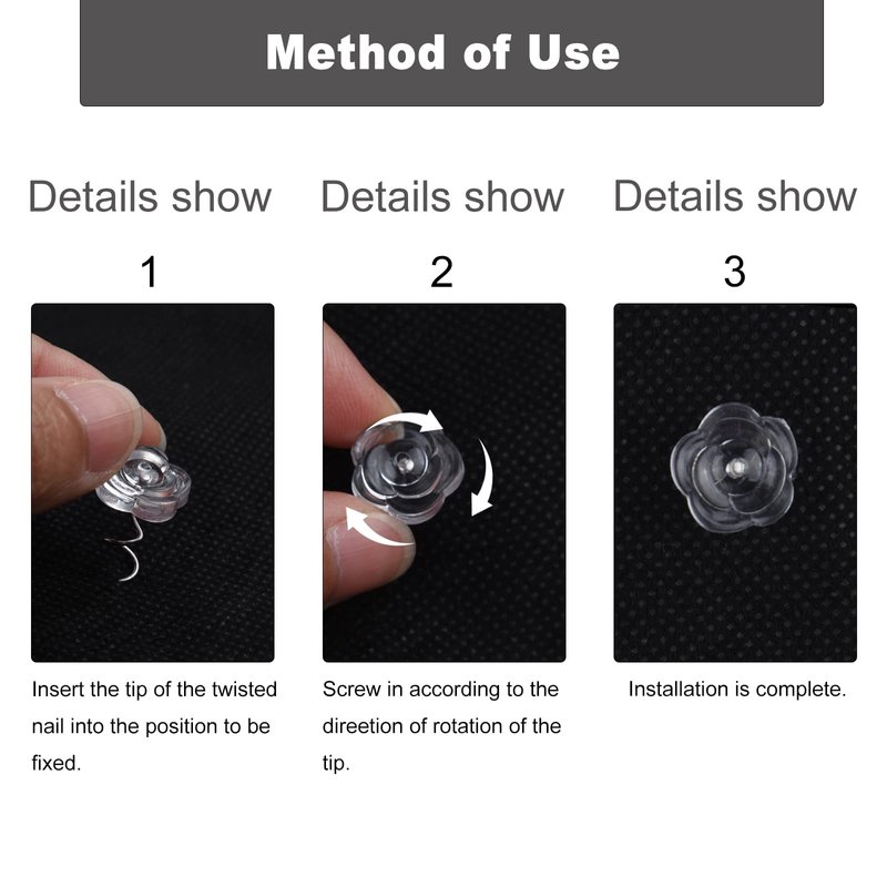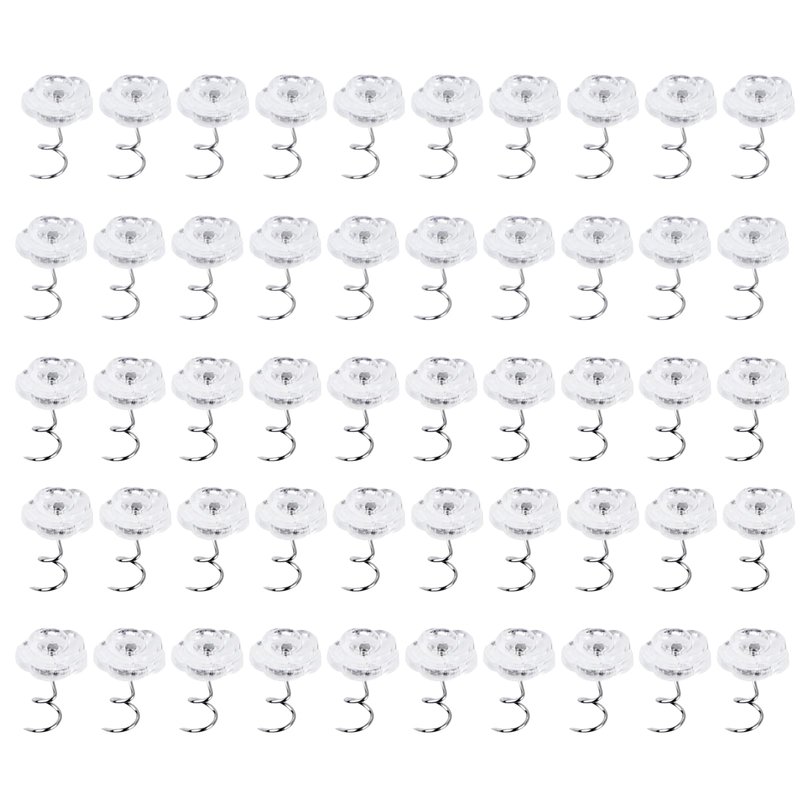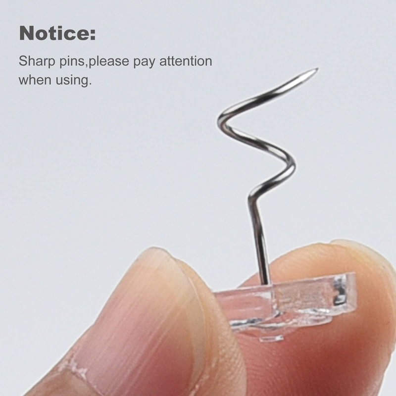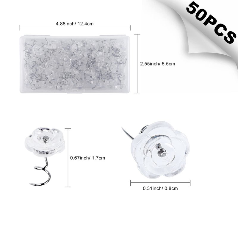 NEBURORA Upholstery Twist Pins Clear Rose Heads Design; Specifications: Material: Plastic heads, Steel pin Color: Clear Designs: Rose shape Diameter of head: approx 0.47 inch/ 12mm; Length of screw pin: approx 0.67 inch/ 17mm; Quantity: 50pcs with Storage Box; Features: -Easy to use and remove; -Keep slipcovers and arm covers in place; -Suitable for medium to light weight fabrics, bedskirts, slipcovers, upholstery and bed ruffles; -Wide applications for upholstery, car headliners, photo and art pin; Notice: The pin is sharp parts, keep away from kids, and please pay attention to safety;