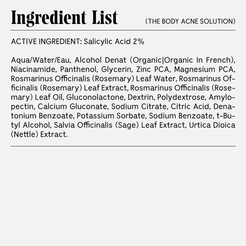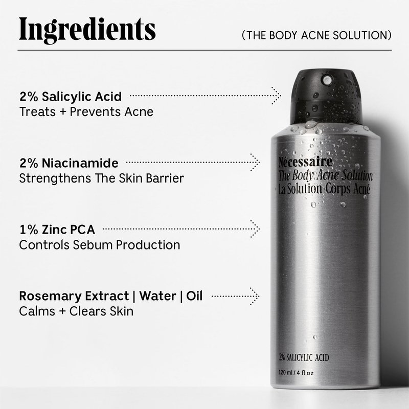 - SKINCARE FOR THE BODY: The Body Solution is a medicated, quick-dry 2% Salicylic Acid clearing spray with Niacinamide, Zinc PCA and Rosemary to treat and prevent body breakouts.