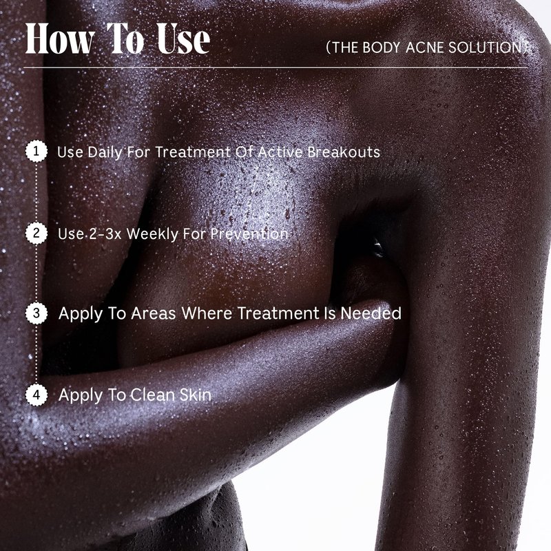 - DIRECTIONS: Apply to areas where treatment is needed. Apply to clean skin. For treatment of active breakouts, use daily. For prevention, use 2-3x weekly. Use sunscreen prior to sun exposure. The Body Acne Solution is delivered in a 360-application sprayer for hard-to-reach areas like the back, butt, upper arms and chest. For optimal results use in tandem with The Body Acne Wash | 2% Salicyclic Acid.