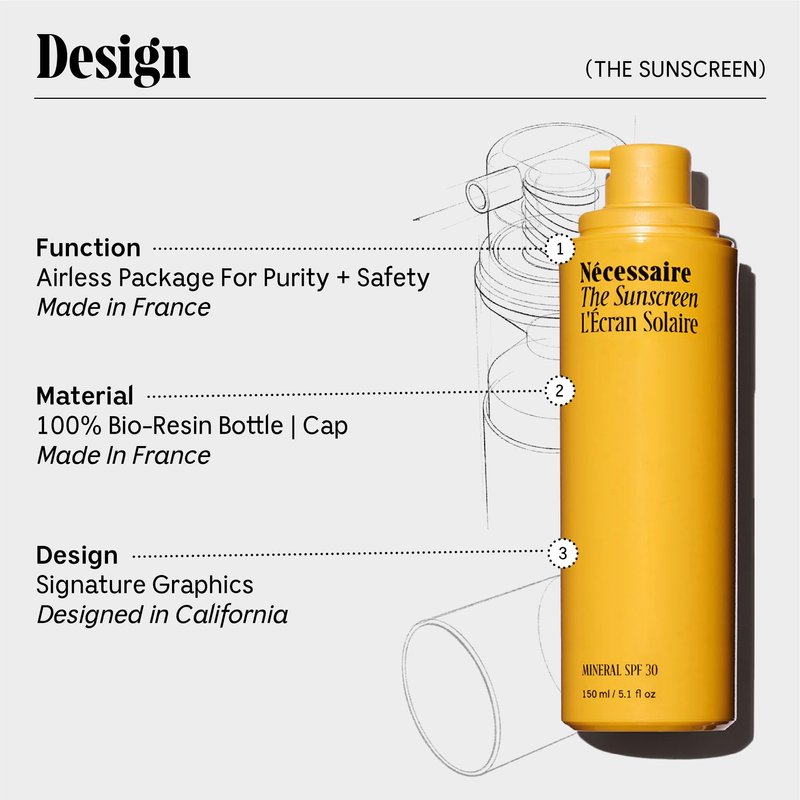 Nécessaire The Mineral Sunscreen SPF 30 PA+++. For The Body. Broad Spectrum. Zinc Oxide, Hyaluronic Acid, Niacinamide. Hydrate. Protect Against Sun Damage + Premature Aging. Dermatologist-Tested 5.1oz