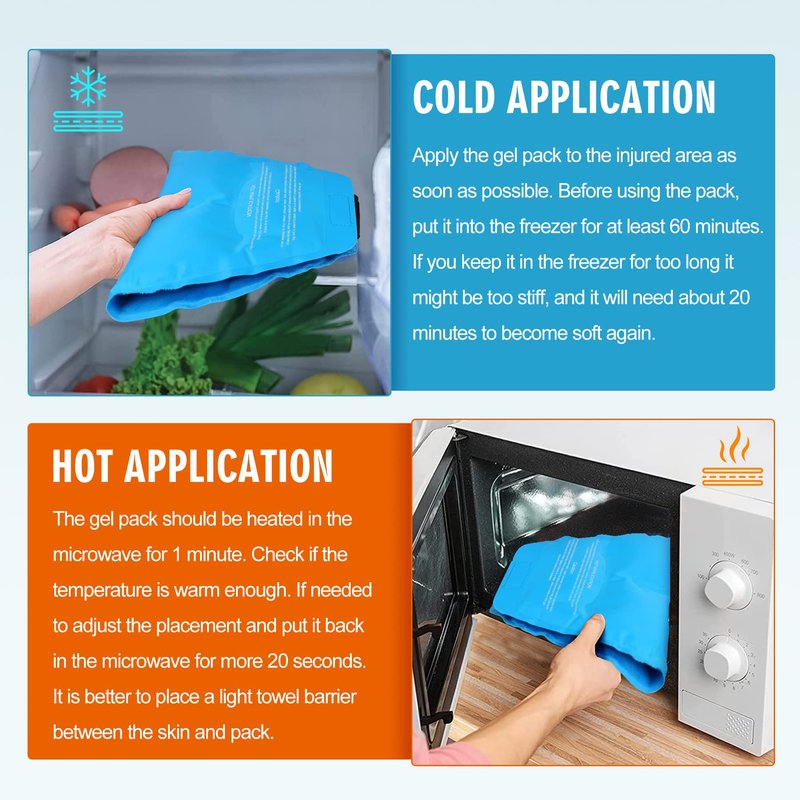 - Dual Purpose Hot and Cold Gel Pack - The gel pack has a soft plush side, the soft plush cover helps your body gradually adapt to the temperature, also avoid condensation water dripping from cooling. We recommend using the plush surface for 10 minutes first. If it's not cold enough or hot enough, use the nylon surface for a cold or hot compress. Gel packs can be used alone and can be used on knees, back, shoulders, hips, neck.