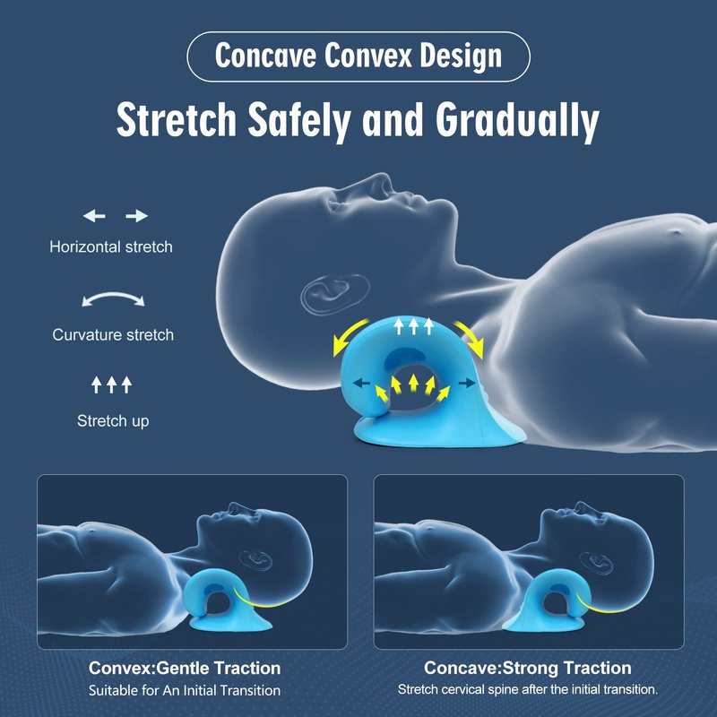 - ERGONOMIC NECK TRACTION PILLOW - The ergonomic C-curve design perfectly matches the human cervical spine, It provides a perfect cervical traction pillow. When you lie down, it offers vertical, horizontal support, and curvature stretch for neck traction, allowing the neck stretcher to gently position the head to reduce spinal pressure, help users maintain a good spinal posture.