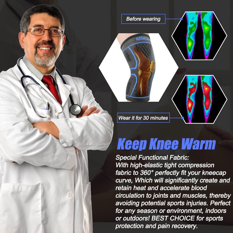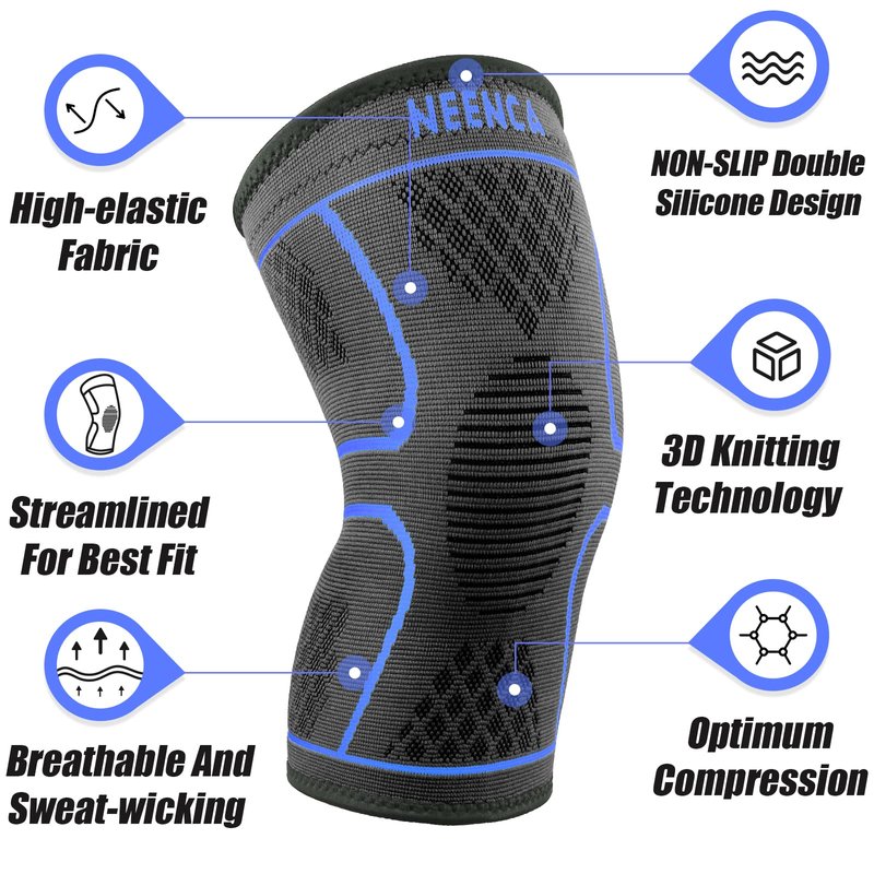 - NEENCA KNEE SUPPORT TECHNOLOGY—With high-elastic and breathable compression fabric to 360° perfectly fit your knee curve, It will help improve poor circulation & increase oxygen to optimize the natural healing process, helping increase blood circulation, and reduce varicose veins, inflammation for leg or knee pain relief from acute or chronic joint injuries. It will strengthen side support and maintains joint stability, keeping your knee warm, BEST CHOICE for sports protection and pain recovery!