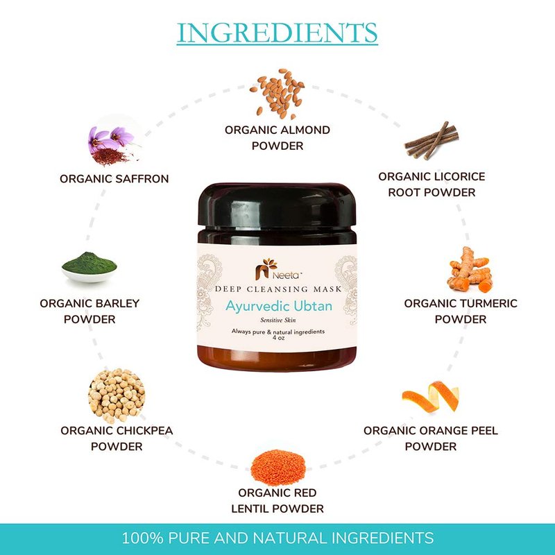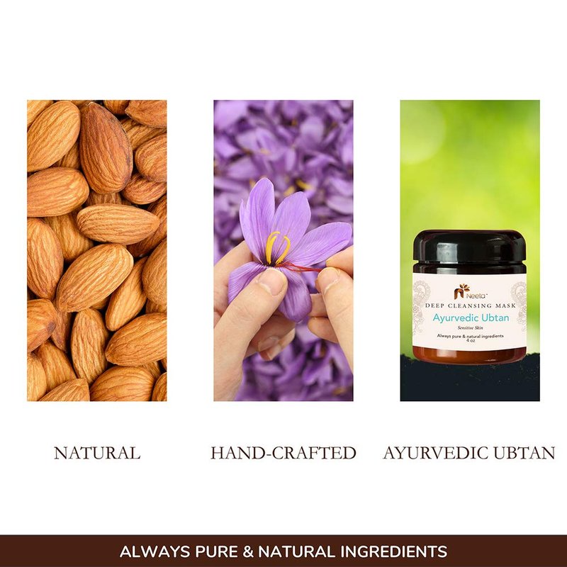 Uncover your skins natural radiance and fresheness with Neeta Naturals Ubtan face mask. Formulated with pure botanical ingredients carefully chosen for their anti-inflammatory, deep cleansing and skin nurturing properties. Ayurvedic Ubtan mask is a traditional east Indian beauty powder used for centuries as a face and full-body treatment. There are many ancient ayurvedic Ubtan recipes that combine different flours and spices. An Ubtan mask may be as simple as combining barley flour, whole wheat flour, and turmeric. Ubtan never contains clay – only flours, herbs, and spices. Neeta Naturals Ubtan face mask formulation is based on traditional recipes and enhanced with ingredients such as Saffron, licorice powder, and chickpea flour. These exotic ingredients help to improve the appearance and health of your skin. Ubtan is used to reduce blemishes, lighten age marks, and improve complexion. If used for 10 days, you will see a remarkable difference in your skin. I suggest taking a picture of yourself before you start using Neeta Naturals Ayurvedic Ubtan and then 10 days later. You will love how the power of these natural ingredients improves the health and vitality of your skin.