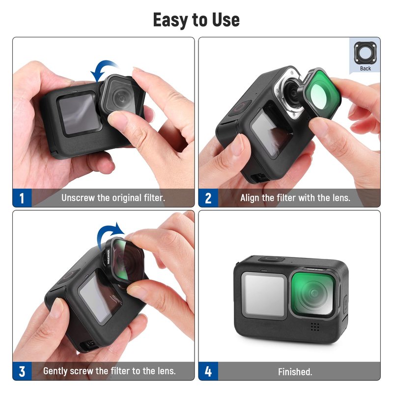 - 【Designed for Action Camera】 Customized for action camera series, and seamlessly compatible with GoPro Hero 12 Hero 11 Black Hero 10 Black Hero 9 Black. Simply twist to mount the filter on the action camera, and effortlessly make a quick, easy swap to another filter when needed