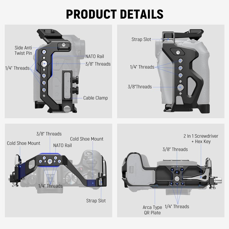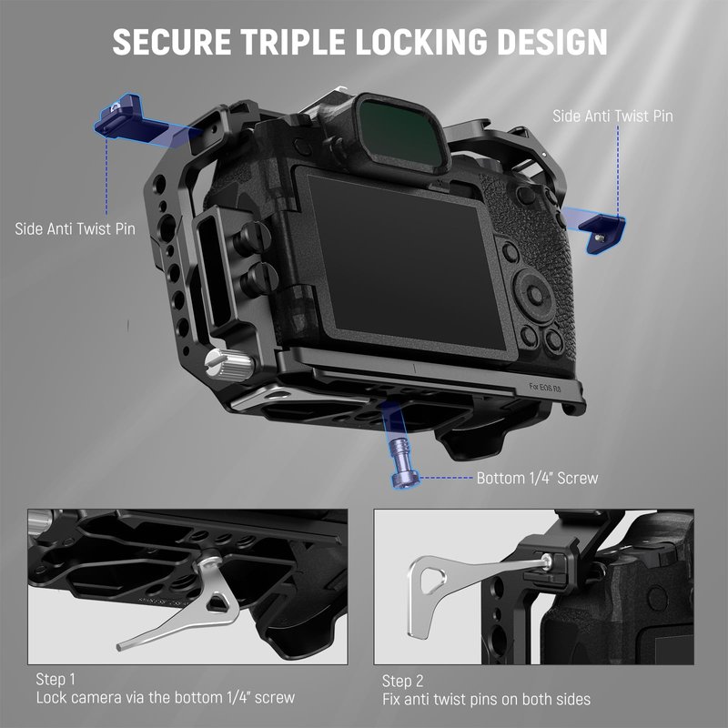- 【Firm Installation By 3 Points】 The cage will firmly attach to your R8 camera via a 1/4" mounting screw and two anti twist pins that fix the camera’s strap eyelets. A nonslip rubber pad protects the camera from scratches while adding extra stability