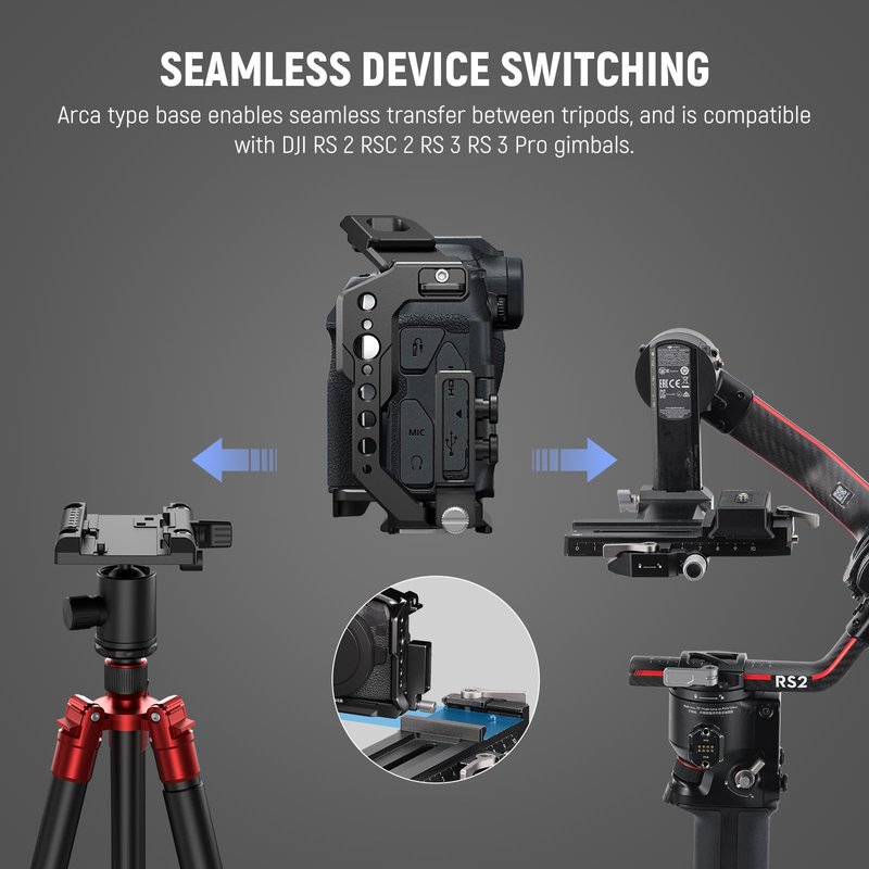 The Arca type baseplate is compatible with DJI RS 2/RSC 2/RS 3/RS 3 Pro gimbals and various tripod heads, giving you the ability to seamlessly transfer the camera from a tripod to a handheld stabilizer for different styles of video recording.
