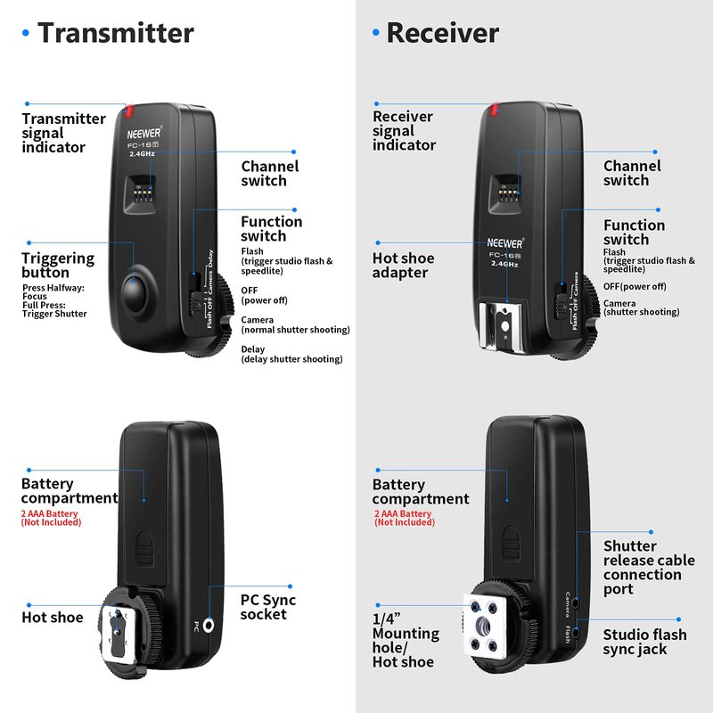 - The Neewer Photo wireless flash trigger receiver and transmitter can serve you in a multitude of functions.