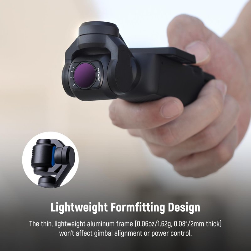 - 【Fast & Secure Magnetic Attachment】 The magnetic design ensures rapid filter changes in just 1 second and provides a secure grip when using auto follow, shooting outdoor sports, or switching between horizontal and vertical shooting. Precision CNC machined lightweight aluminum frame (0.06oz/1.62g each) seamlessly fits the gimbal without any impact on gimbal calibration or storage
