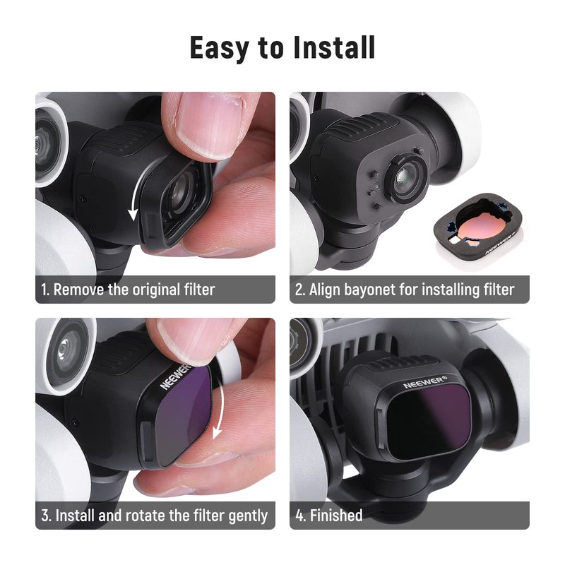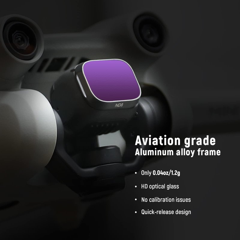 - 【Lightweight Design】 The filter frame is made of aviation aluminum alloy, and the edge of the frame adopts CNC non-slip design, which is easy to install and disassemble. It weighs only 1.2g without affecting drone calibration and balance.