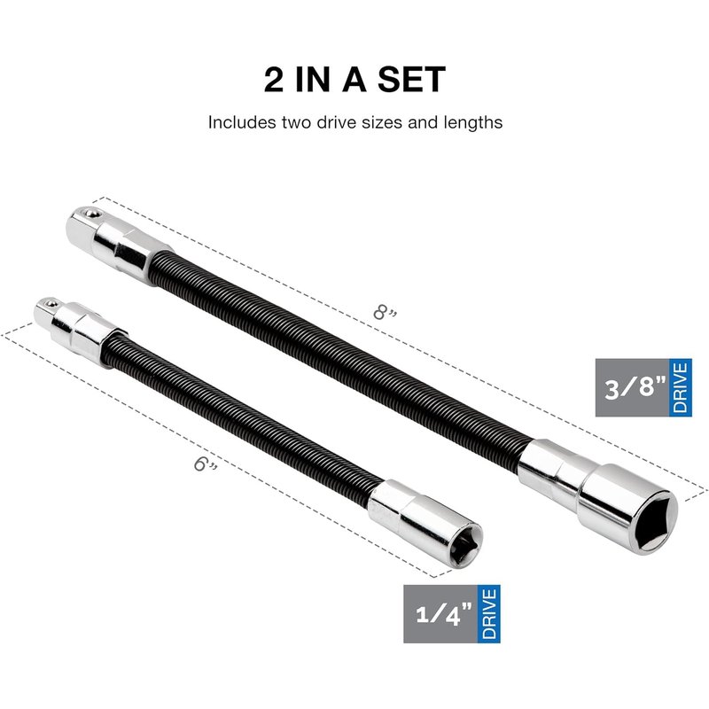 - SIZES INCLUDED: This 2-piece set includes an 8-inch extension flex bar with a 3/8-inch drive and a 6-inch extension flex bar with a 1/4-inch drive. Add this superior extension gear to any mechanic toolbox for automotive repairs.