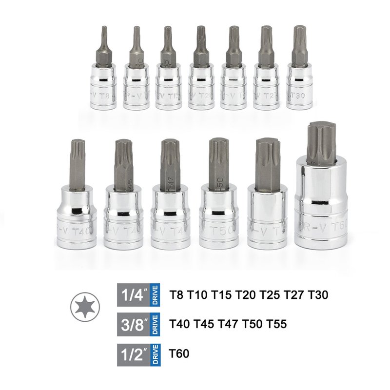 - 13-Piece Torx star bit socket set includes: 1/4” Drive: T8, T10, T15, T20, T25, T27, T30; 3/8” Drive: T40, T45, T47, T50, T55; 1/2” Drive: T60