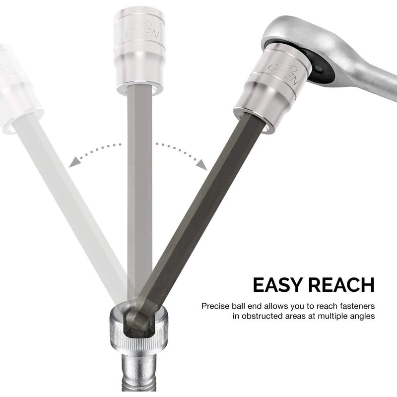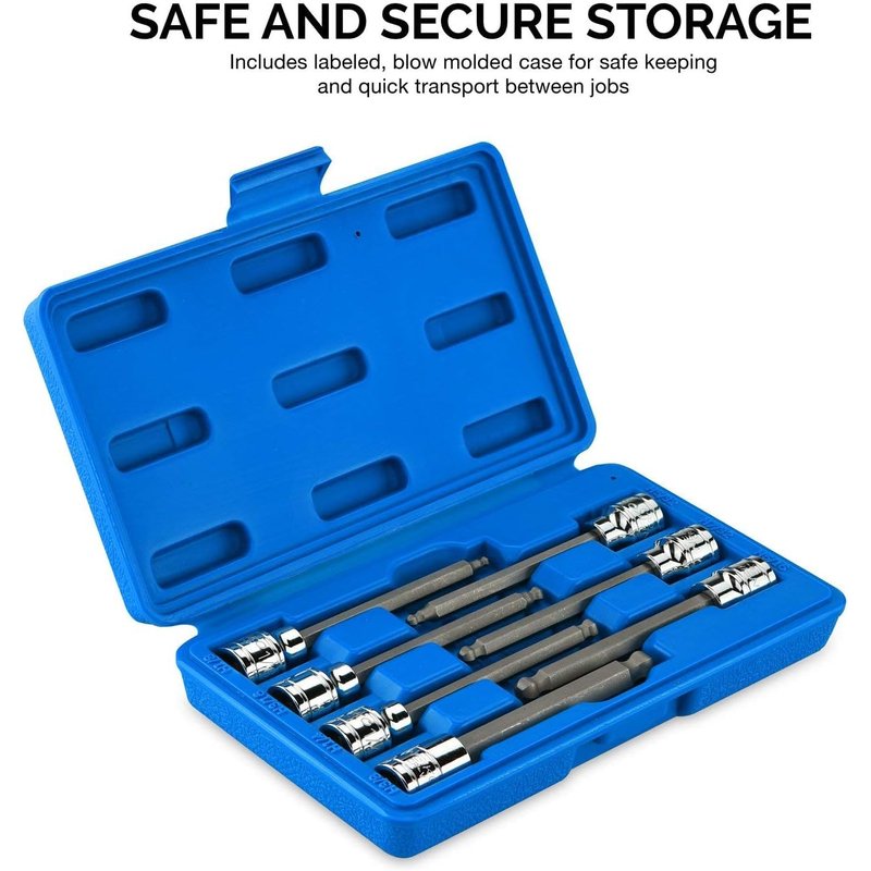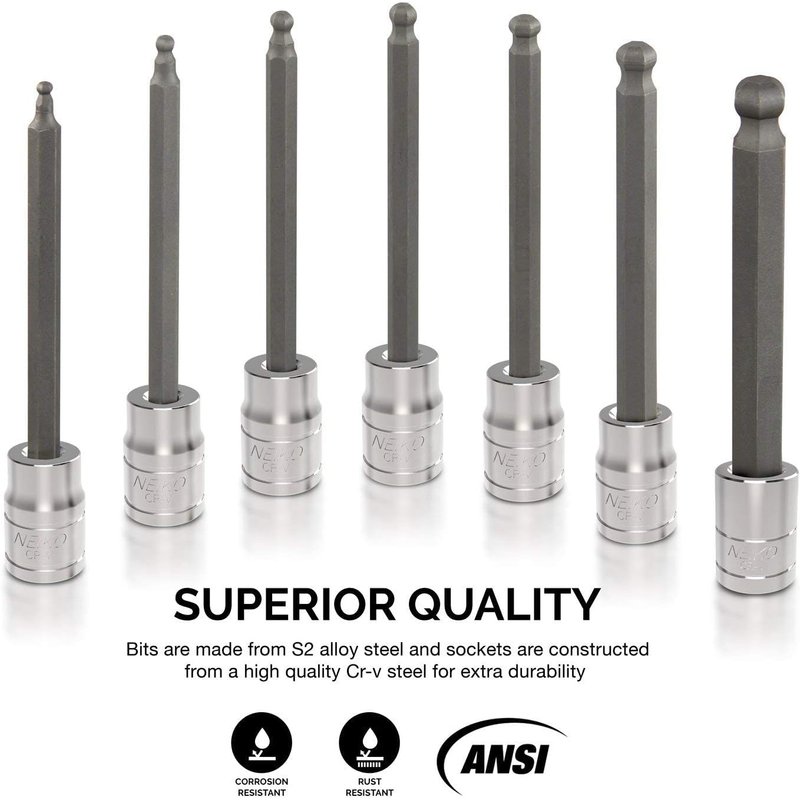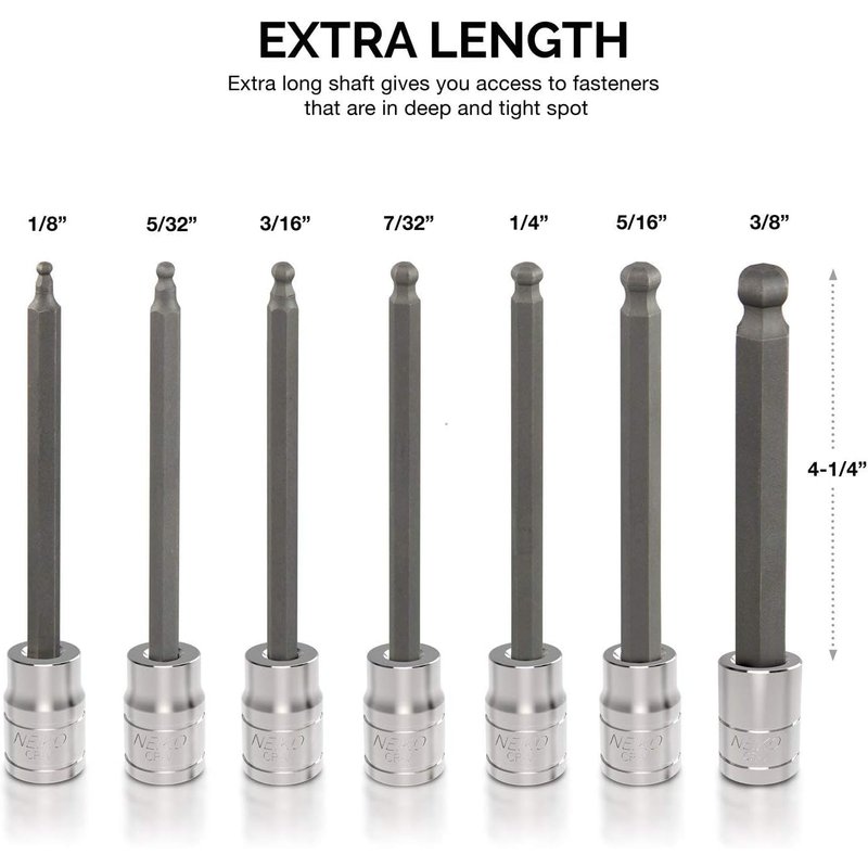 Neiko 10072A 3/8-Inch Drive Extra Long Allen Hex Bit Socket Set, SAE, 1/8-Inch - 3/8-Inch | S2 and Cr-V Steel, 7-Piece Set