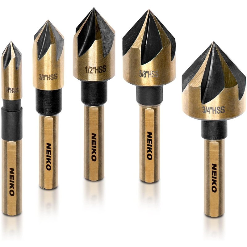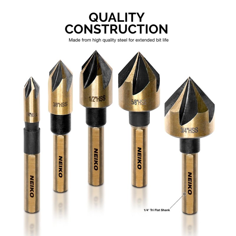 NEIKO 10218A Countersink Drill Bit Set for Wood and Metal, 1/4” Tri-Flat Shank, 5 Piece Countersink Bits, M2 High Speed Steel