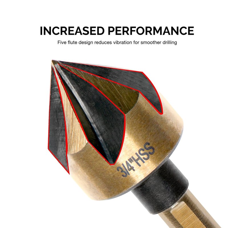 - FIVE-FLUTE DESIGN: Each of the 5 counter sink bits utilizes a five-flute design that reduces vibration for smoother drilling as found in woodworking with a 1/4-inch shank that allows easy gripping.